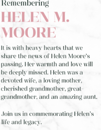 Helen Marie Moore passed away peacefully on October 3, 2025, at the age of 92. Born in Burleson County, Texas on June 9, 1933, she was a cherished daughter to the late Willie C. and Viola Williams. Helen was a proud graduate of E.A Kemp High School in Bryan, Texas. Following graduation, her artistic flair and desire to care for others led her to earn her Cosmetologist Certificate in 1962. For many years, she brightened the lives of her clients as a talented stylist, retiring to focus on her family and community involvement with her longtime church, Galilee Missionary Baptist Church. Her commitment to service was evident in her many years as a dedicated Usher at Galilee Missionary Baptist Church. She greeted every person with a warm smile and ensured all felt welcome as they entered for worship.